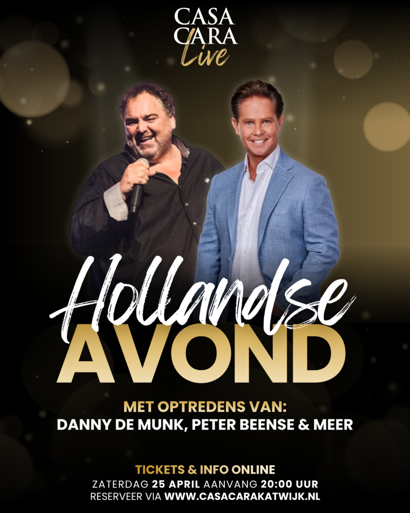 Op zaterdag 25 april nodigen wij je uit voor een sfeervolle en feestelijke Hollandse Avond bij Casa Cara. Met optredens van Danny de Munk, Peter Beense en diverse andere artiesten, gecombineerd met een DJ, belooft dit een complete avond uit te worden.